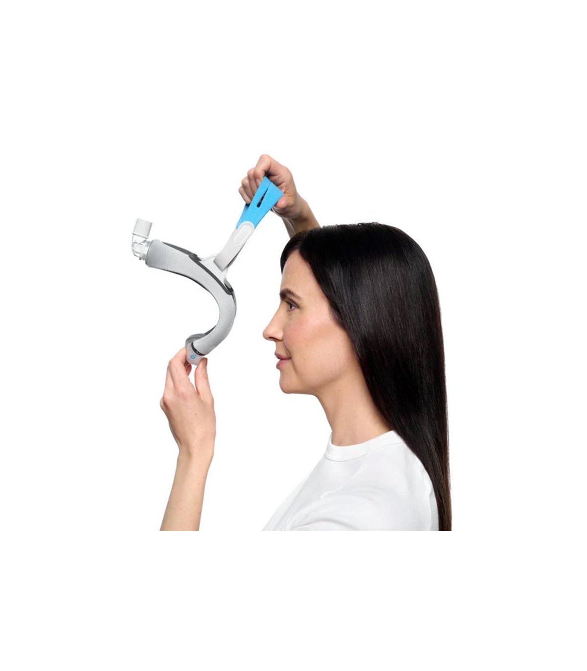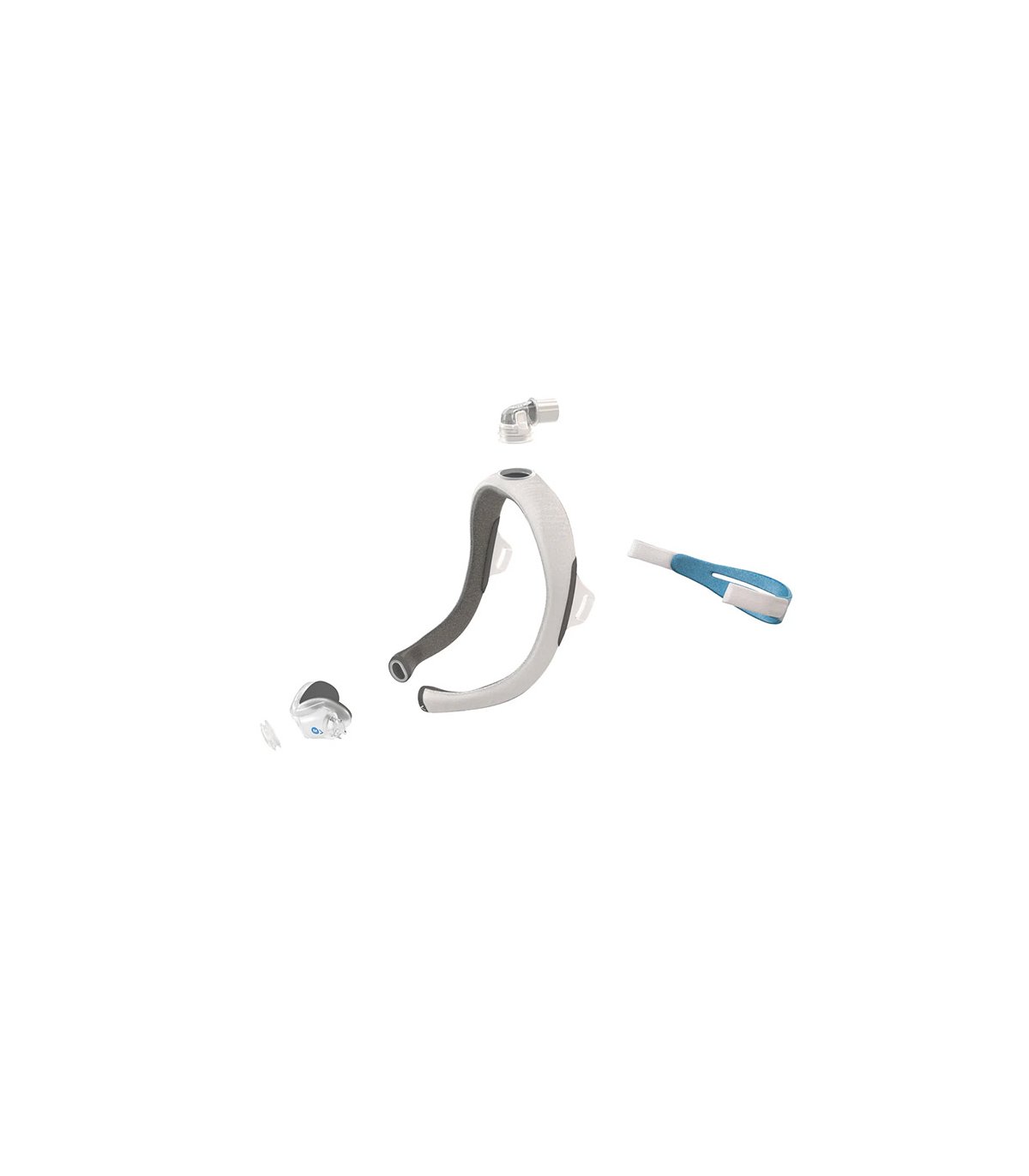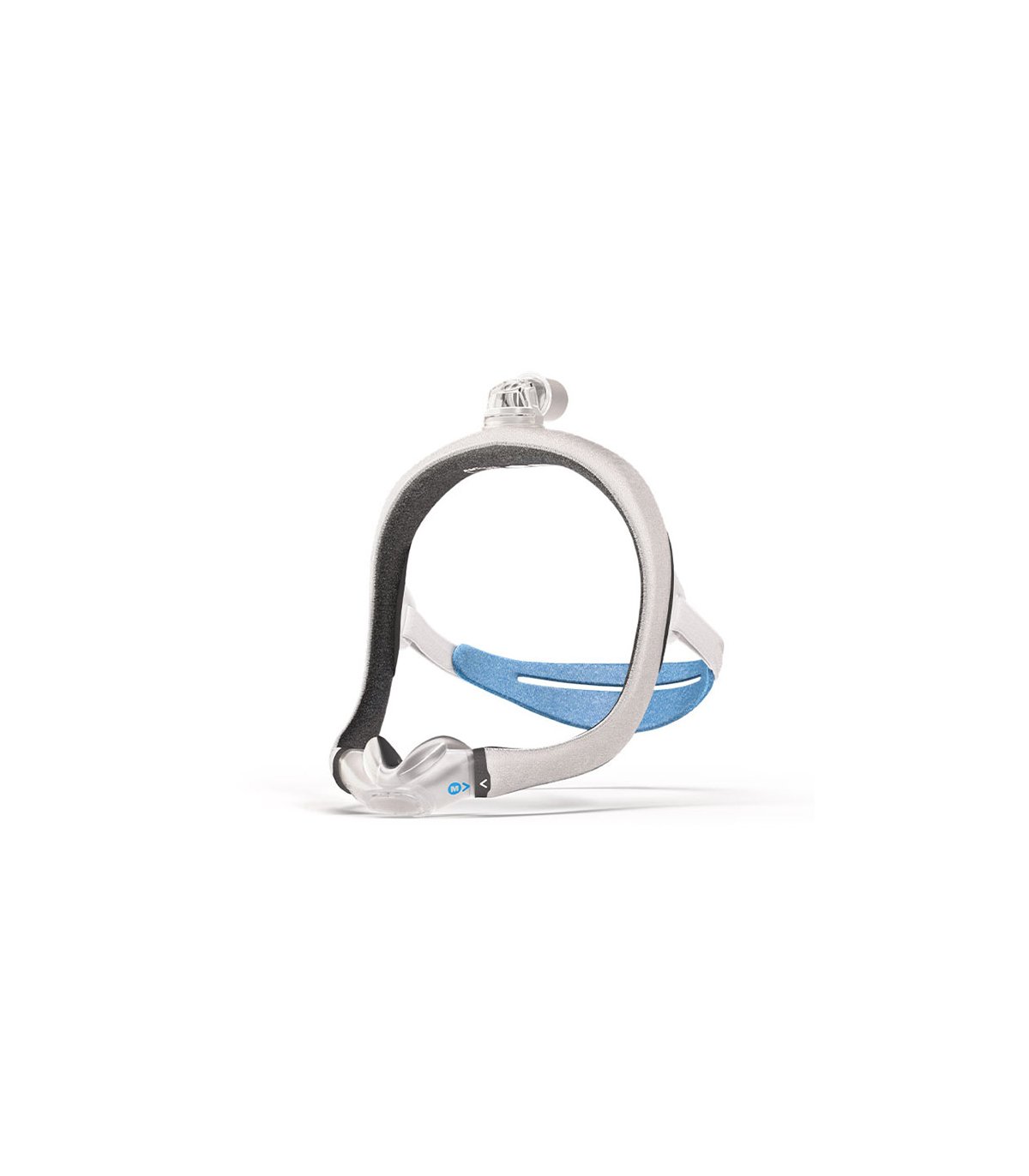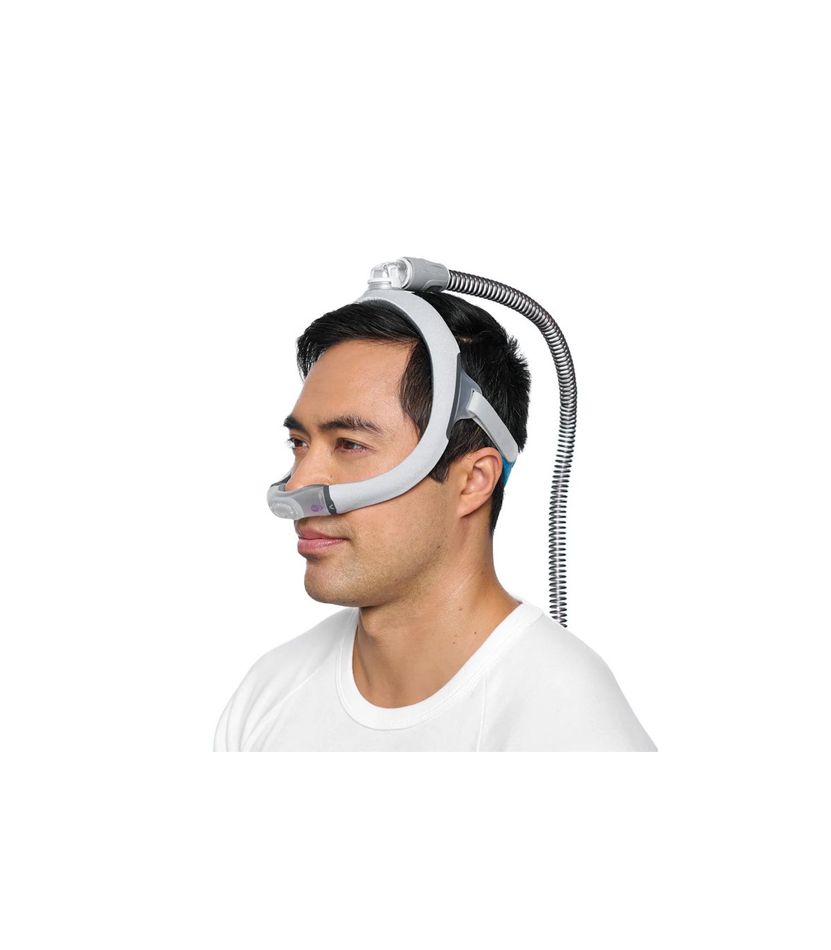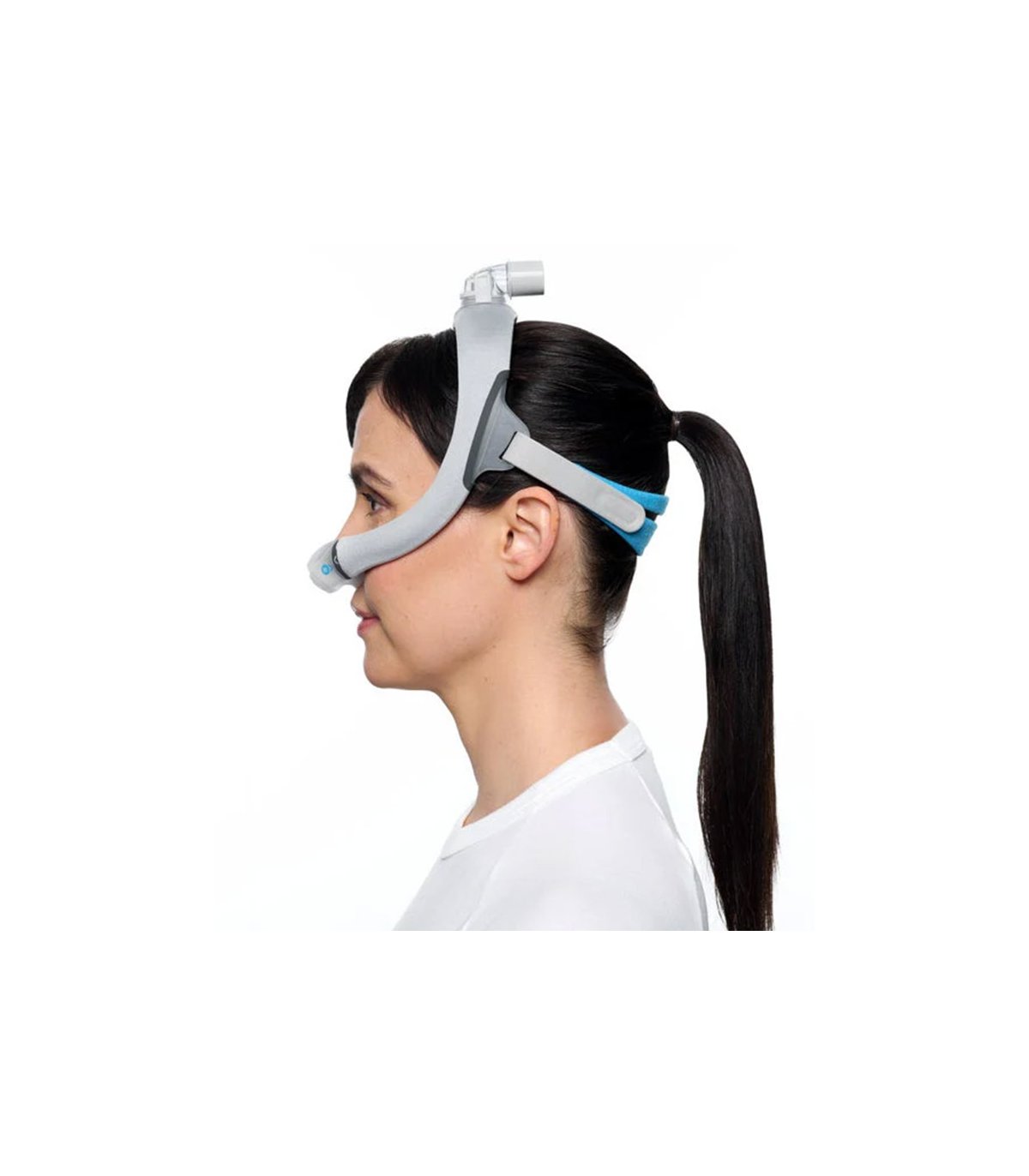 Máscara nasal tube-up, diseñada por ResMed para combinar comodidad y libertad de movimiento durante la terapia CPAP. El tubo posicionado por encima de la cabeza libera el campo visual y reduce el volumen, permitiendo dormir cómodamente en cualquier posición sin limitar los movimientos.
