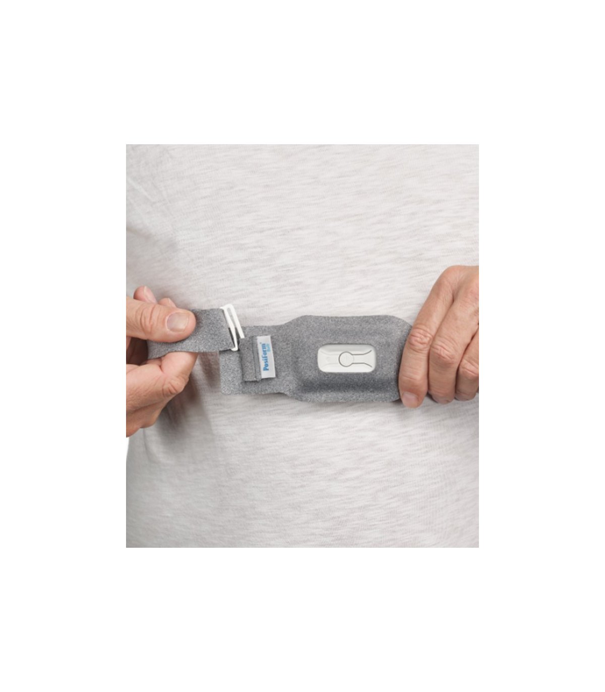 Posiform Belt es un cinturón torácico diseñado para reducir los ronquidos y las apneas del sueño posicionales, alentando a quien lo usa a dormir de lado. Integra un dispositivo electrónico de vibración inteligente que detecta la posición supina y activa una vibración para favorecer el cambio de postura.